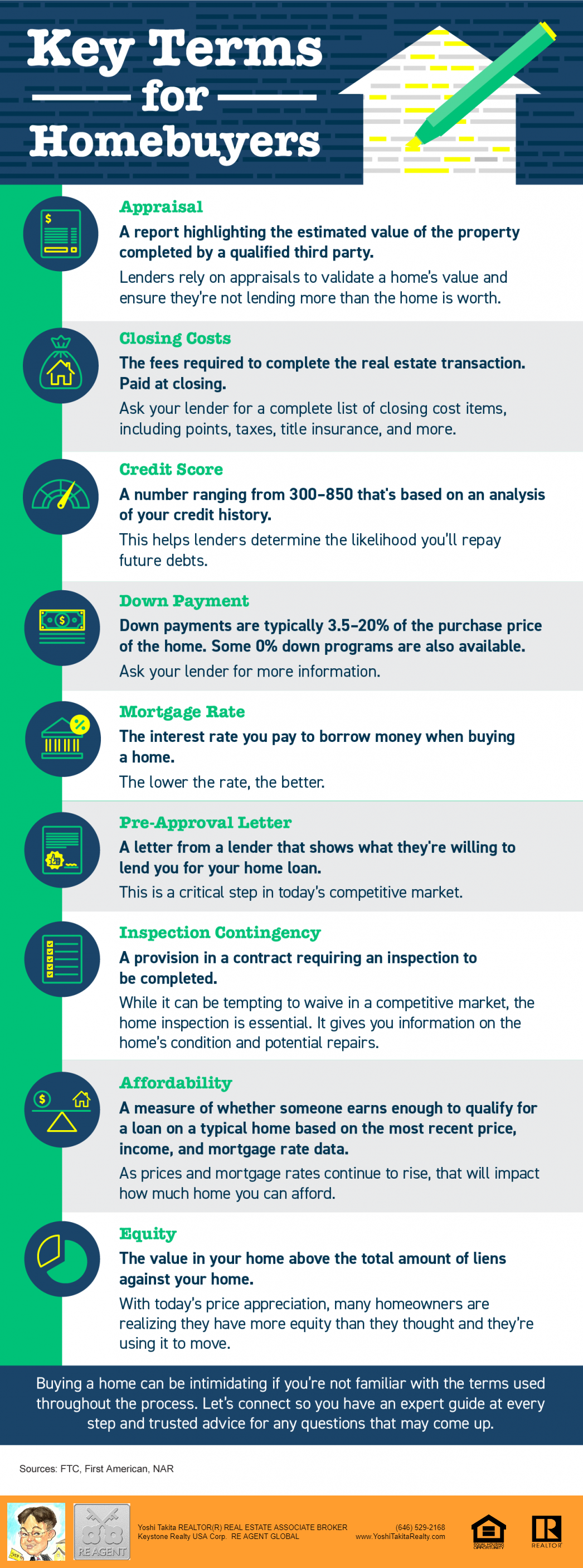 Key Terms for Homebuyers [INFOGRAPHIC] Key Terms for Homebuyers [INFOGRAPHIC] | MyKCM Some Highlights Knowing key housing terms and how they relate to today’s market is important. For example, when mortgage rates and home prices rise, it impacts how much home you can afford. Terms like appraisal (what lenders rely on to validate a home’s value) and the inspection contingency (which gives buyers essential information on a home’s condition) directly impact the transaction. Buying a home can be intimidating if you’re not familiar with the terms used throughout the process. Let’s connect so you have an expert guide and advice for any questions that may come up.